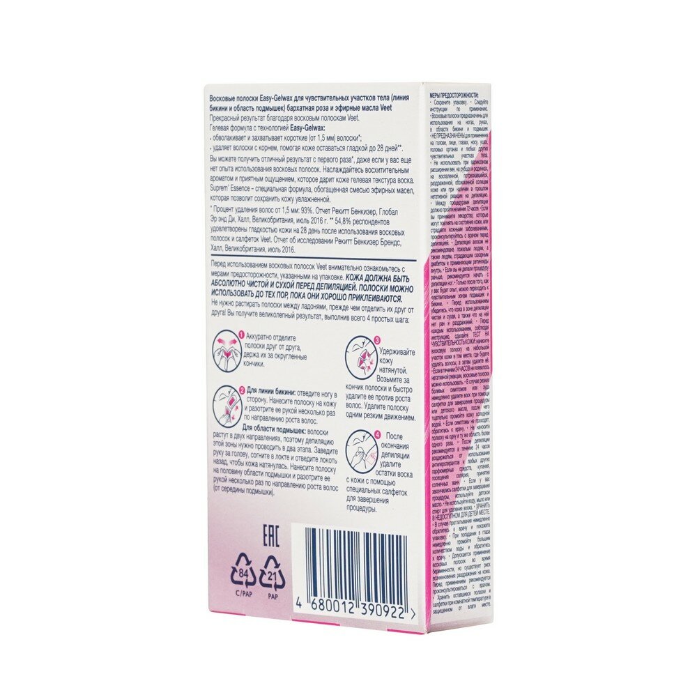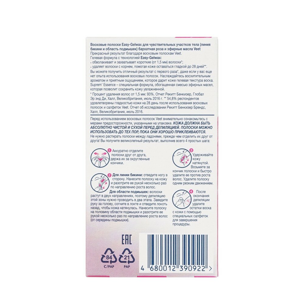 Veet восковые полоски для чувствительных участков тела (линия бикини и область подмышек) с ароматом бархатной розы и эфирными маслами c технологией easy gel-wax 14 шт.
