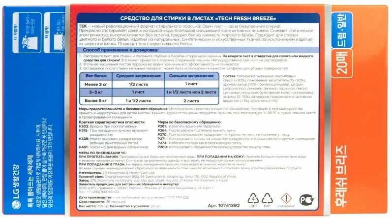 Могут забиться под дверцу стиральной машины, лучше класть их в мешок для стирки. Притягивают к себе грязь и мелкий мусор. На упаковке вся информация на корейском языке, есть так же дополнительная картонка этикетка с информацией на русском, но информация немного отличается. В русском варианте сказано, что эти салфетки являются эквивалентом 5 кг стирального порошка, а в корейском 2.16 кг. Кому верить? Аромат "свежего бриза" больше похож на цветочный. На упаковке так же написано "придаёт белью нежный цветочный аромат". Причём тут тогда свежий бриз? |