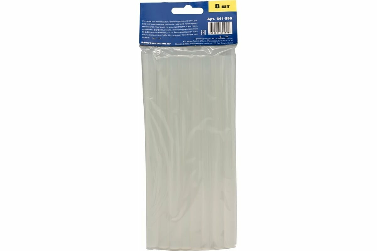 ПРАКТИКА Клей для клеевого пистолета белый, прозрачный, 11x200мм, 8 шт /пакет с подвесом 641-596