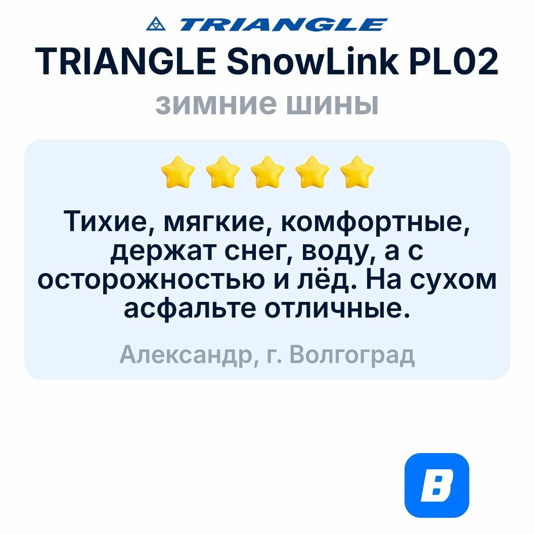 Ездил при температуре +3 градуса дня три. Жестковатая, но не жёстче летней, у меня Тигуан 2018 года спортлайн 19 радиус. Сама по себе машина жесткая. И на летней. Т к профиль низкий. И подвеска так настроена. Думал купить эти дешевые за 23 тыс комплект или за 60 тыс комплект. До этого ездил на зимней всегда хакапелита была с шипами радиус 16 хакапелита 6, и 17 хакапелита 8. 6 хакапелита была офигенная 2 сезона отъездил на форд фокусе. Ни один шип не вылетел при жесткой эксплуатации. Хакапелита 8 стояла на Шкода суперб один сезон, передние шины потёрли 50% шипов. И сейчас тигуан на 19 колёсах. Цены от 10 до 18 за балон известные бренды. Подумал нахер надо если шипы через сезон не будут уже за что я тогда переплачиваю. Купил эти триангл рискнул. В дождь как на летней едешь. Все супер. Сегодня пошёл первый снег и асфальт приморозило. Как на катке. Гололёд голимый. Едет великолепно. При трогании без пробуксовки до 60 км едешь тормозишь останавливается практически как на асфальте. Единственной где начала скользить это под уклон ехал и лёд был с мокриц жижой. Тогда начала скользить. Но за такие бабки мне нравится все в этой резине. Сам искал одзым о ней ни одного не нашёл. Вот пищу теперь чтобы знали. Берите. Не прогадаете. |