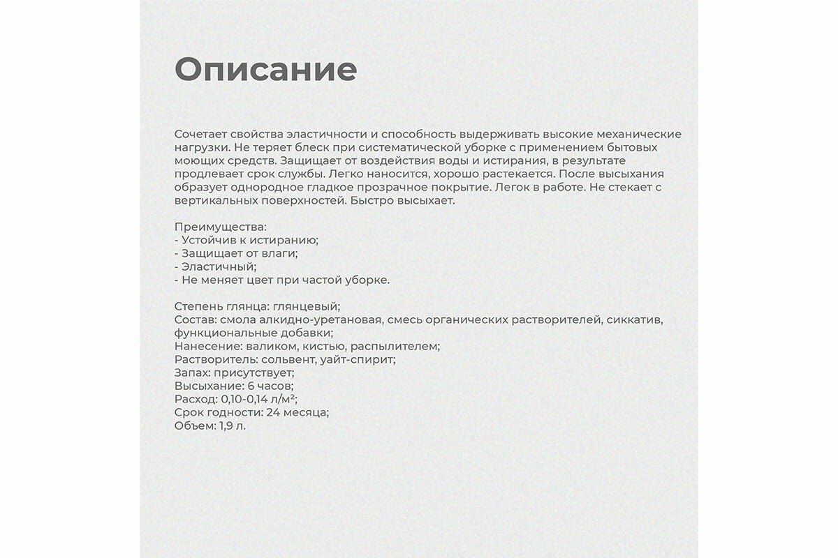| Плюсы: | Практически не пахнет. Быстро сохнет. Даёт красивый блеск поверхностям. |