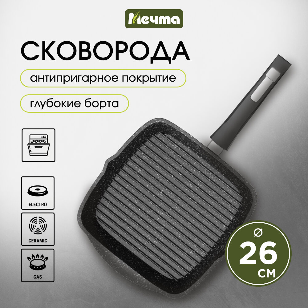Сковорода гриль Мечта квадратная 26х26 см Гранит с антипригарным покрытием с несъемной ручкой, НЕ индукционная