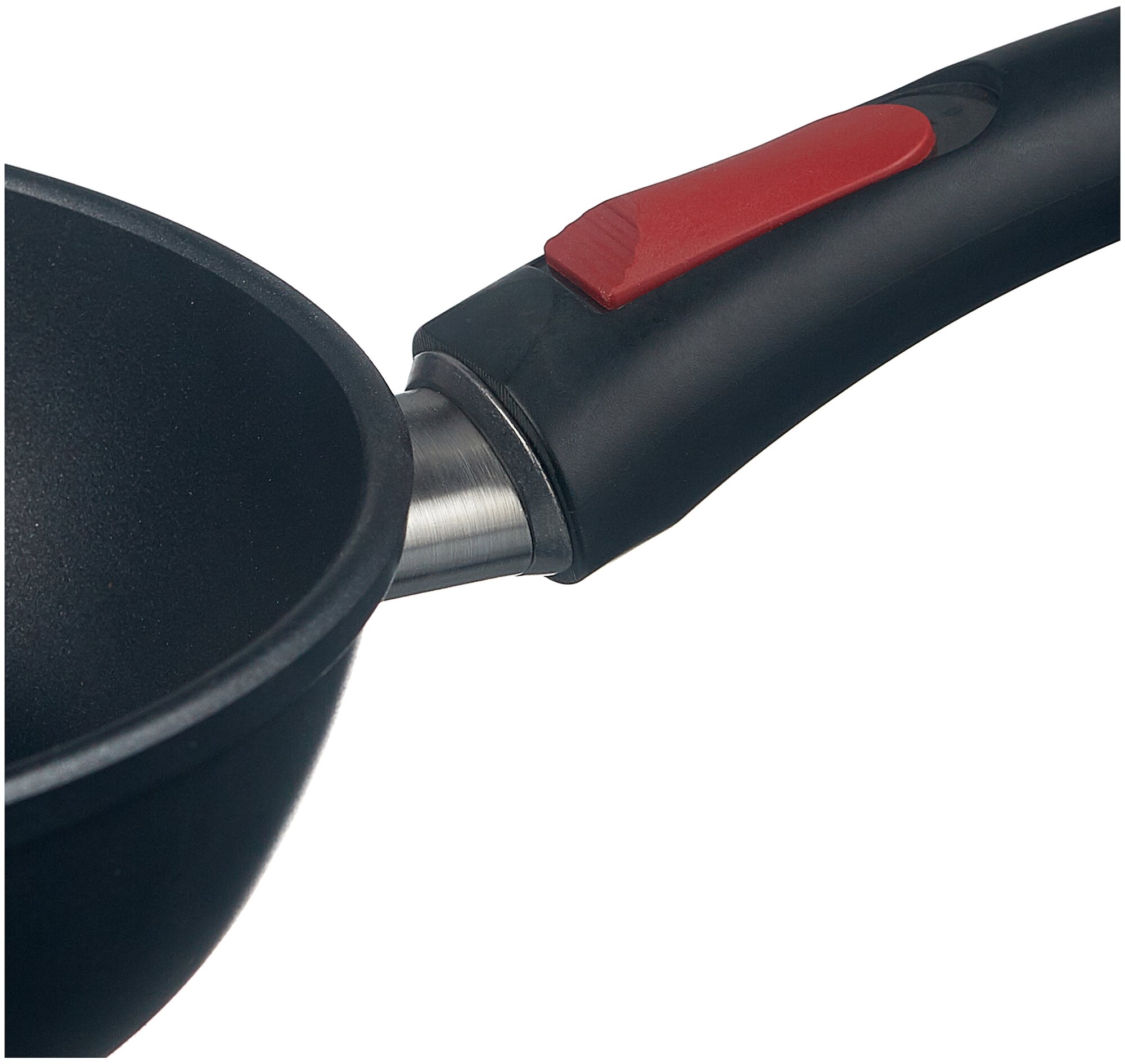| Плюсы: | Отличное качество изготовления. Съёмная ручка при достаточном уровне сноровки позволяет её пристёгивать не придерживая сковородку второй рукой. |