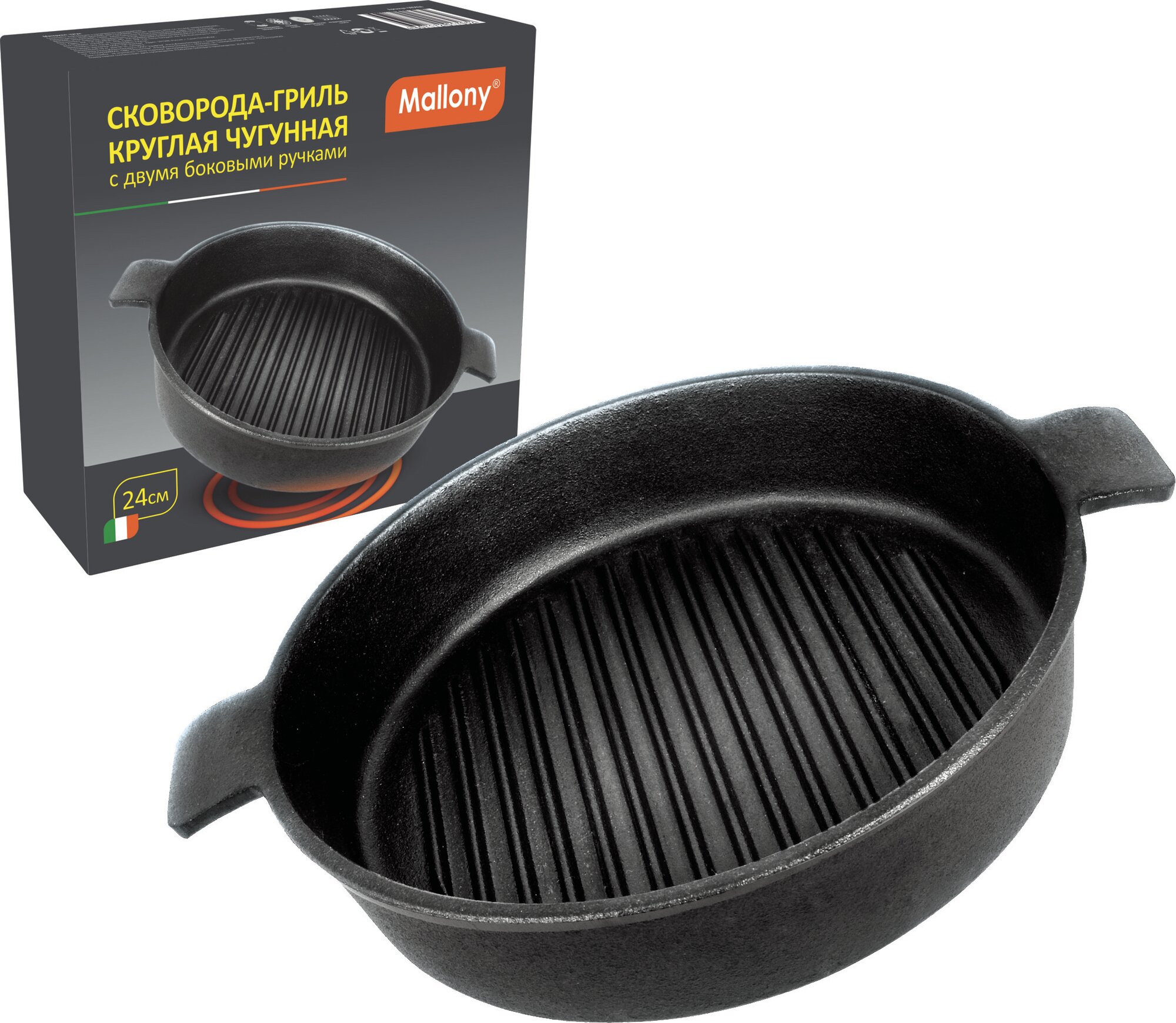 Сковорода-гриль MALLONY 24 см б/покр. чугун индукц. 2 руч.