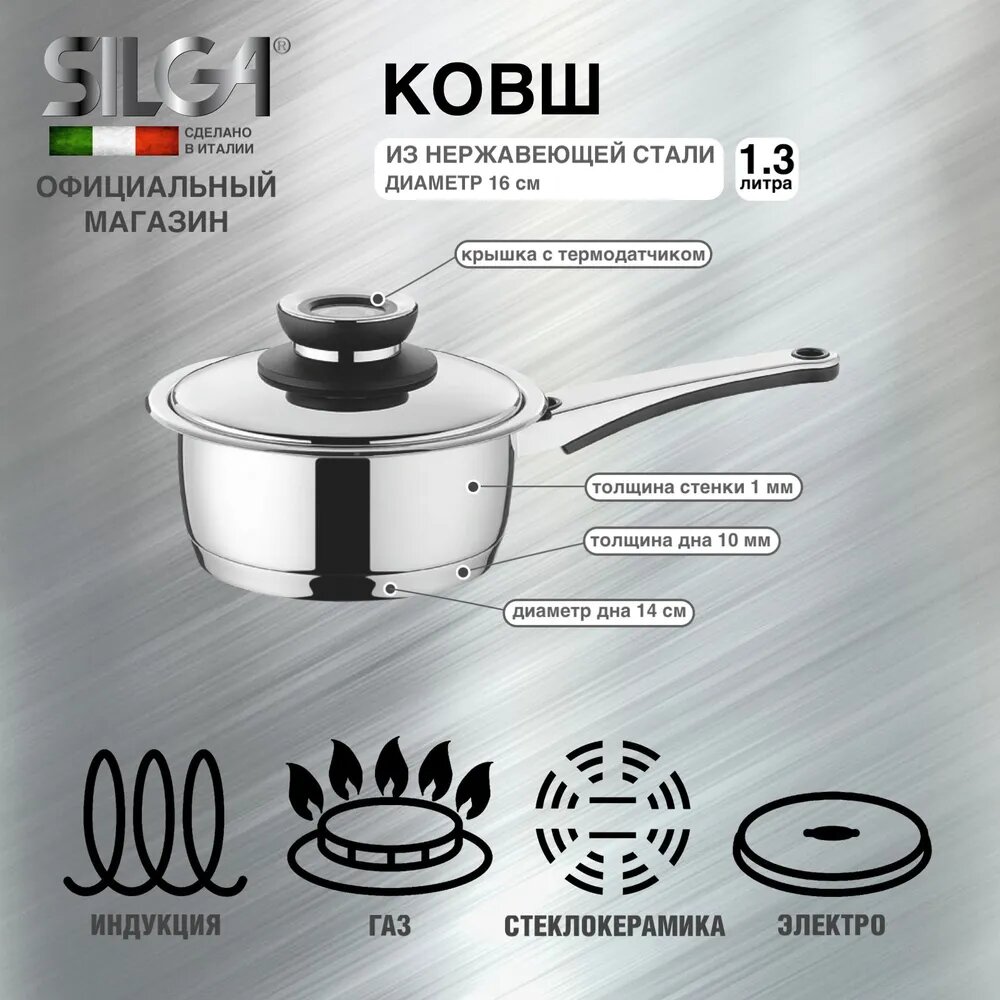 Ковш и крышка с термодатчиком SILGA 2012 16 HQ, 16см, 1,3л, для индукционной плиты из нержавеющей