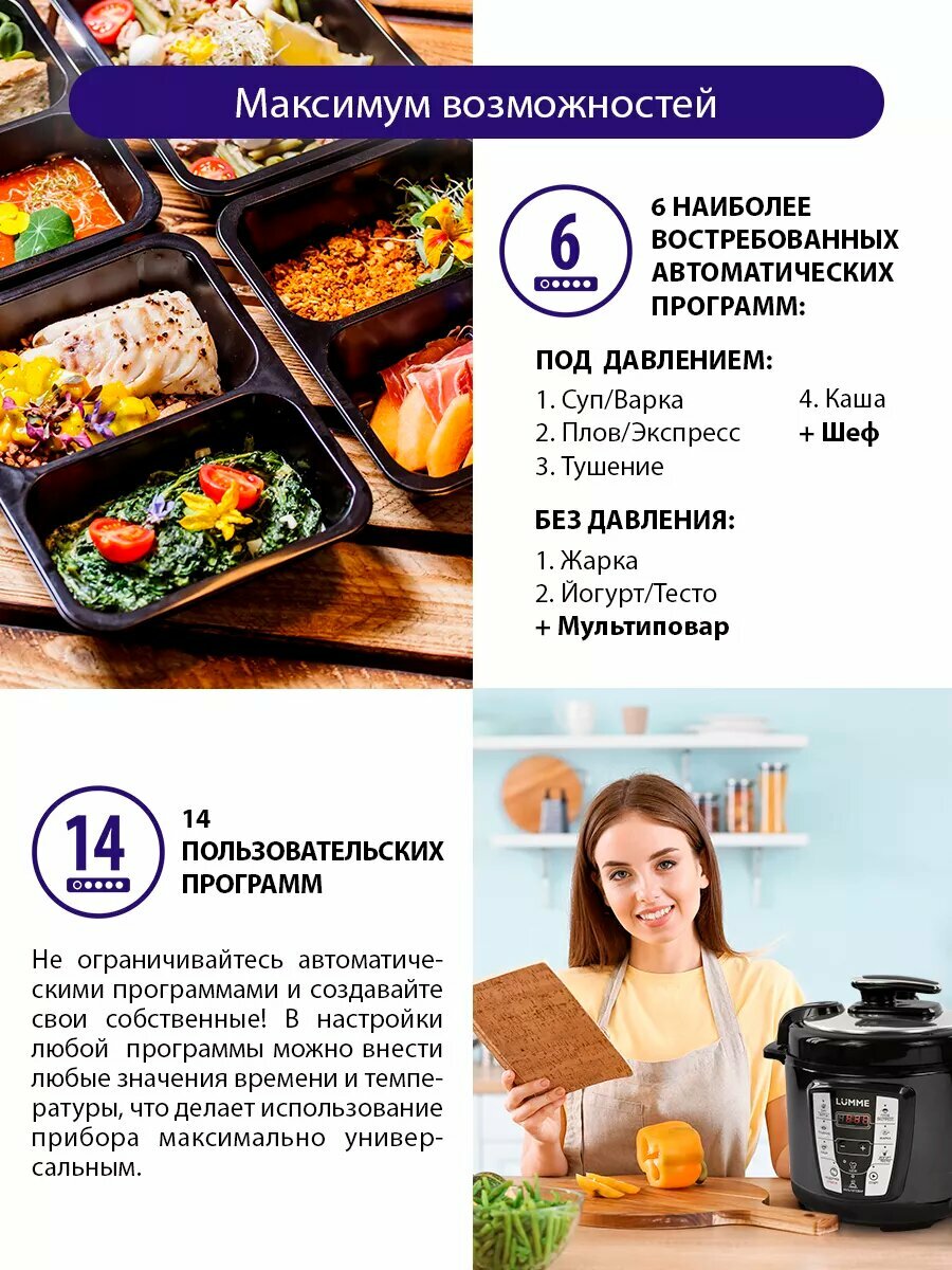 | Плюсы: | Мультиварка Lumme LU-1450 Black/Pearl это отличный выбор по низкой цене в магазине МВИДЕО с гарантией |