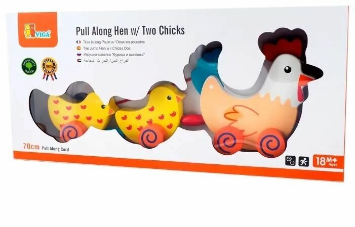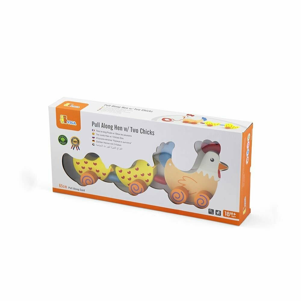 Каталка на веревочке Курочка с цыплятами в коробке VIGA 50078