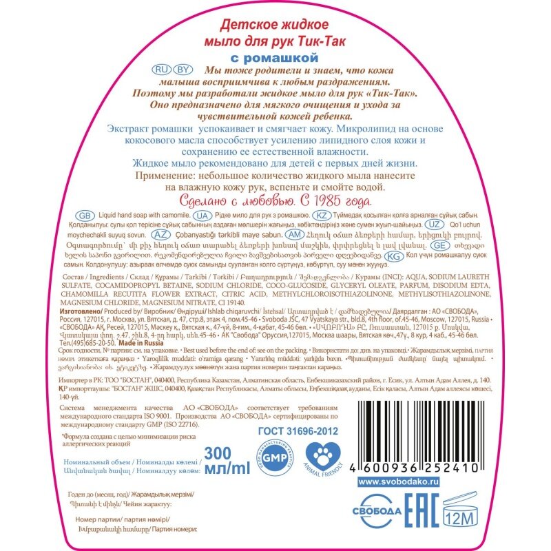 Мыло жидкое для рук свобода ТИК-ТАК с ромашкой, детское, гипоаллергенное 300 мл. 4600936252410