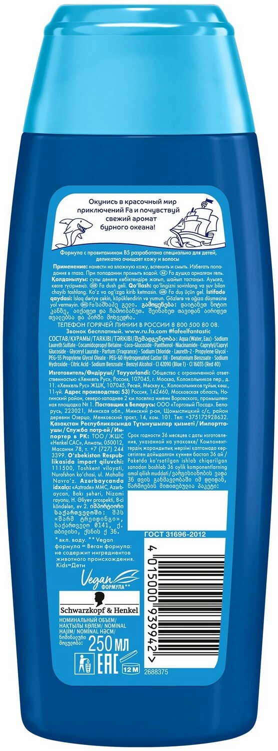 Fa Гель для душа детский Kids, аромат бурного океана, нежный к коже, 250 мл