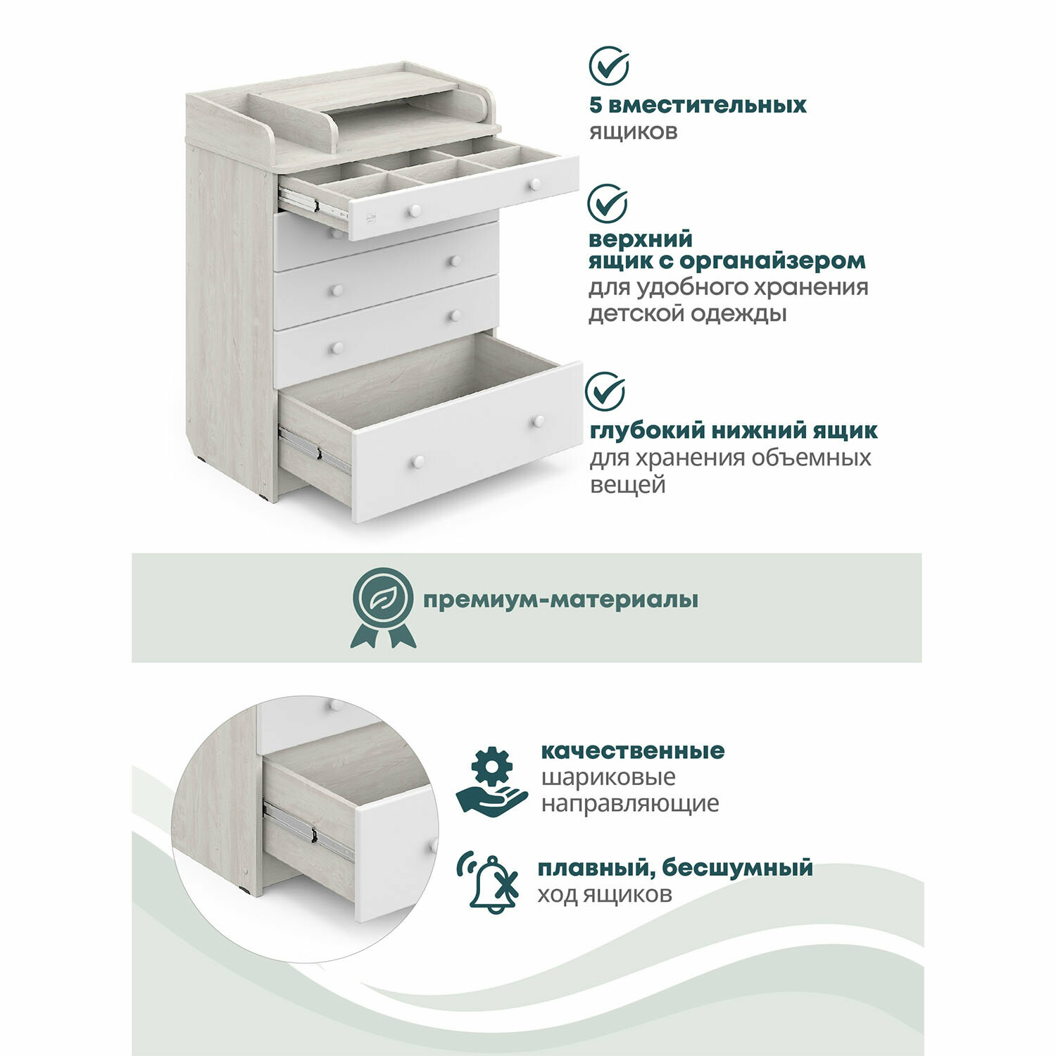 Комод пеленальный "Maks" с органайзером шариковые направляющие 5 ящ, ясень севилья-белый