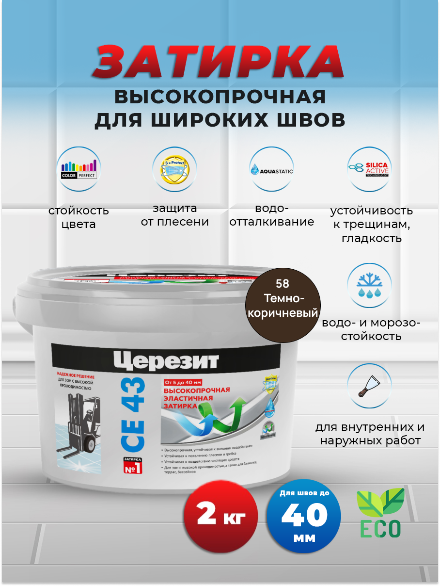 Затирка цементная для широких швов высокопрочная Ceresit CE 43 2кг, 58-темно-коричневый