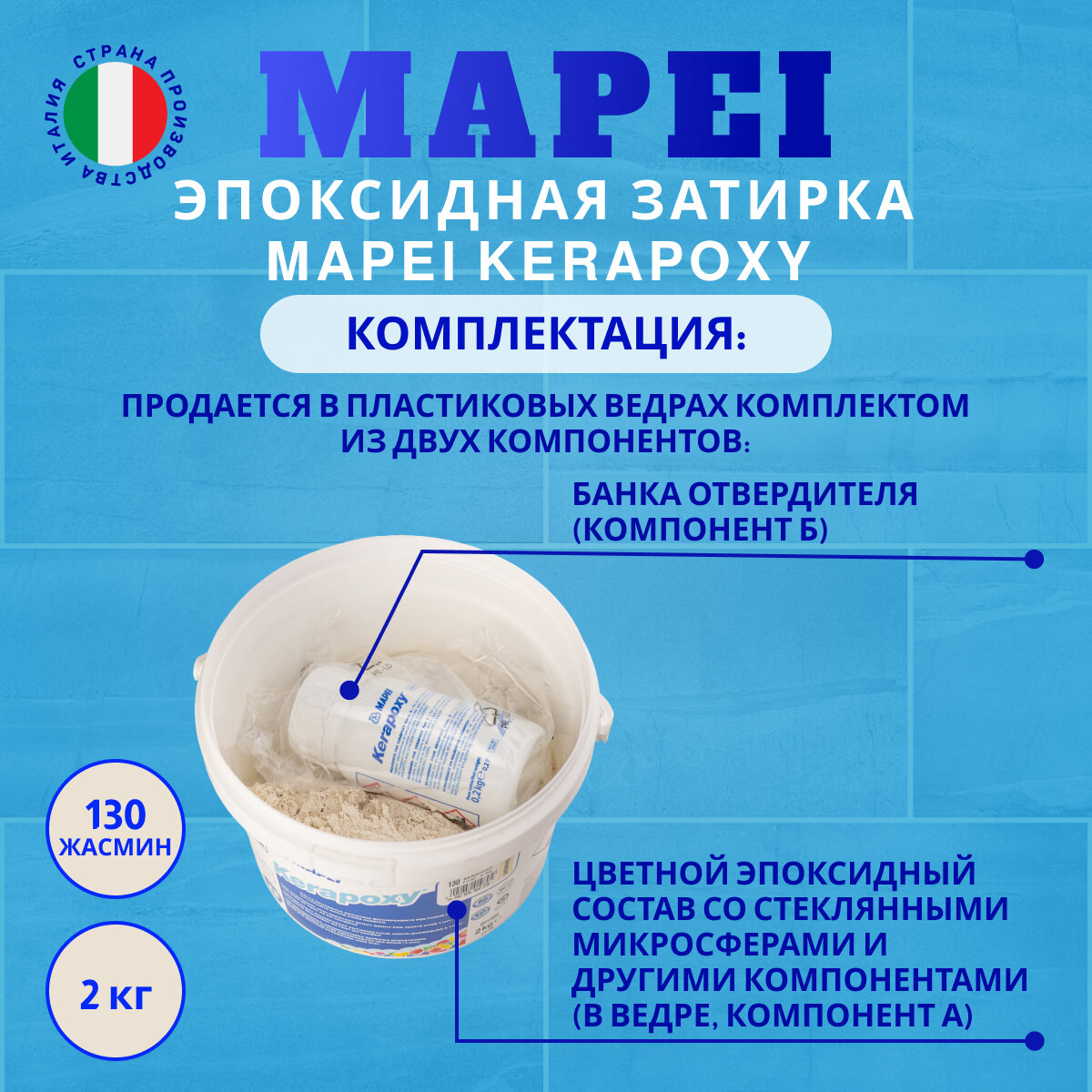 Ниже Вы можете прочитать отзывы на Эпоксидная затирка MAPEI Kerapoxy 130 Жасмин , 2 кг, ознакомится с подробными характеристиками, посмотреть интересные обзоры и фотографии на Эпоксидная затирка MAPEI Kerapoxy 130 Жасмин , 2 кг.