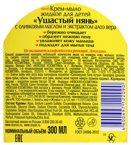Детское крем-мыло "Ушастый нянь", с оливковым маслом и алоэ вера, жидкое, 300 мл