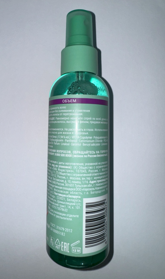 Придаёт обьем , не склеивает волосы Прекрасно . Пользуюсь больше 10 лет. |
