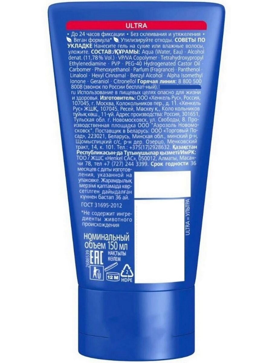 Практически не фиксирует волосы Дешевый гель, который не выполняет функцию "сверхсильной фиксации" (как написано на упаковке), использую для удаления "пышноты" волос после мытья головы |