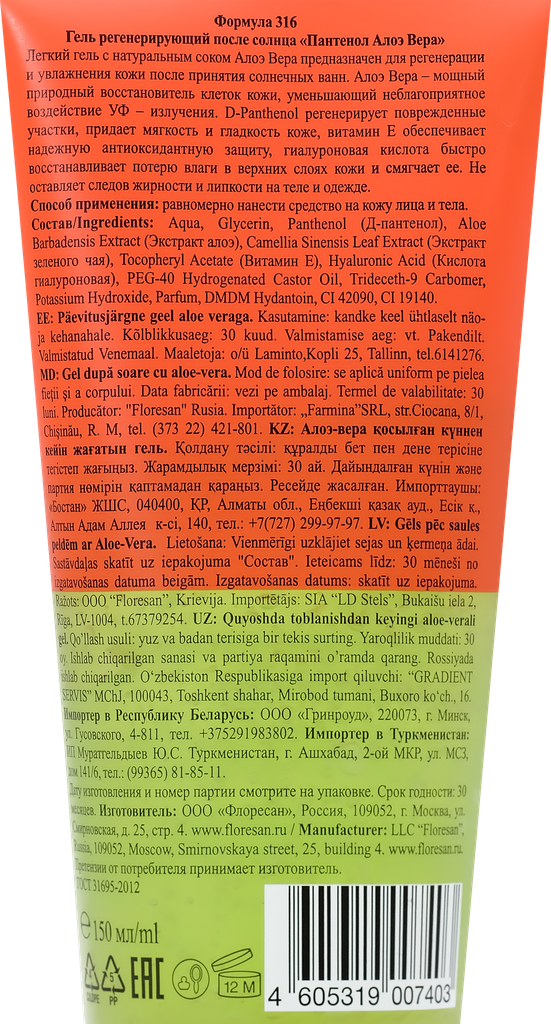 Гель после загара Флоресан Пантенол "Регенерирующий" с алоэ вера 150 мл 42316/Ф-316 деф.