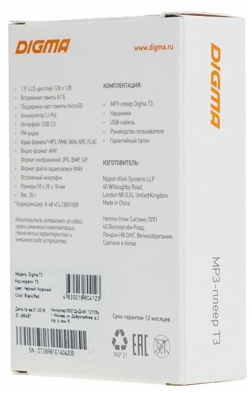 Купить MP3-плеер DIGMA T3 8Gb 8 ГБ, черный/красный