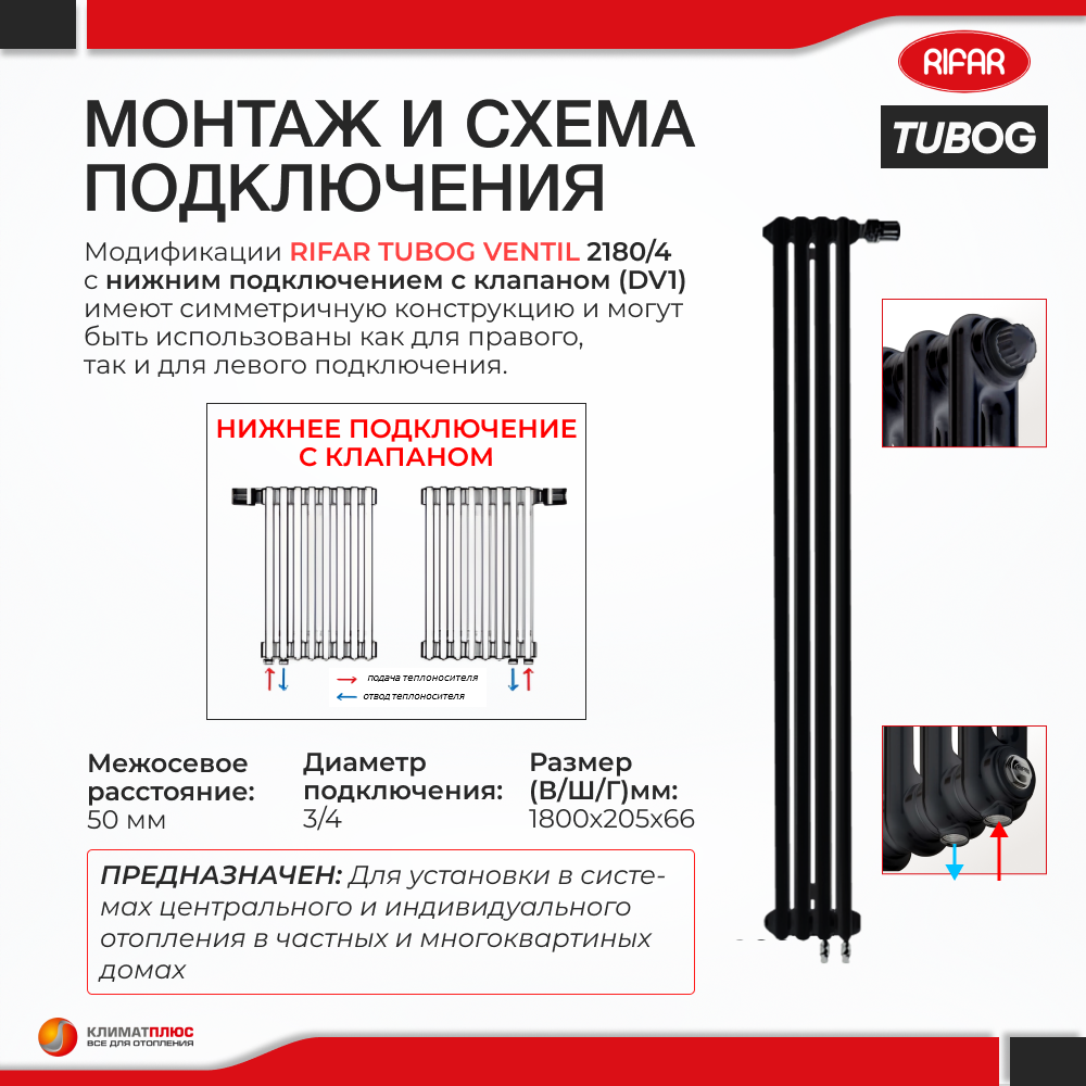 Радиатор отопления Rifar Tubog Ventil 2180 / 4 секции, нижнее подключение, вертикальный, трубчатый, цвет белый Ral 9016