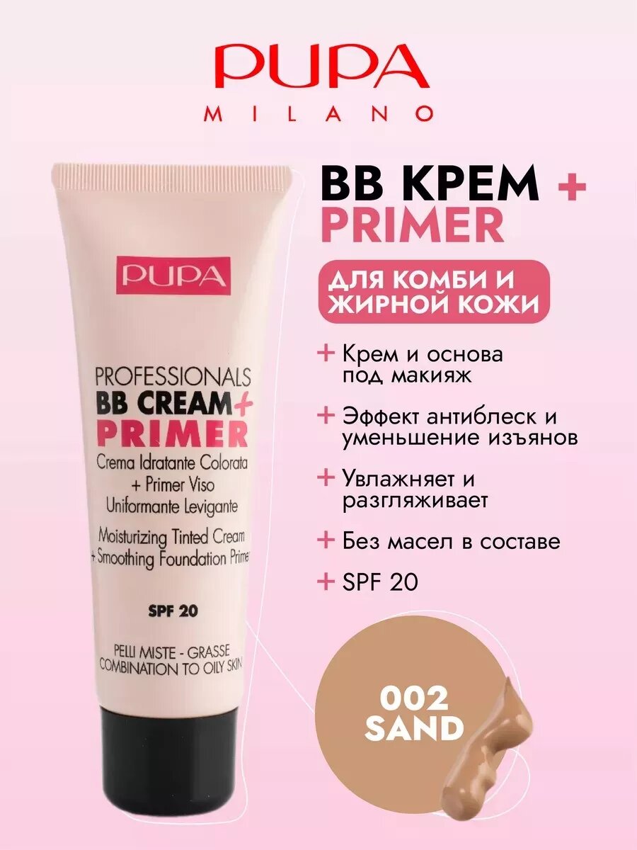 Pupa BB CREAM + PRIMER Увлажняющий крем-тон + основа под макияж с выравнивающим и разглаживающим эффектом для всех типов кожи тон 002, Sand (песочный) 50мл