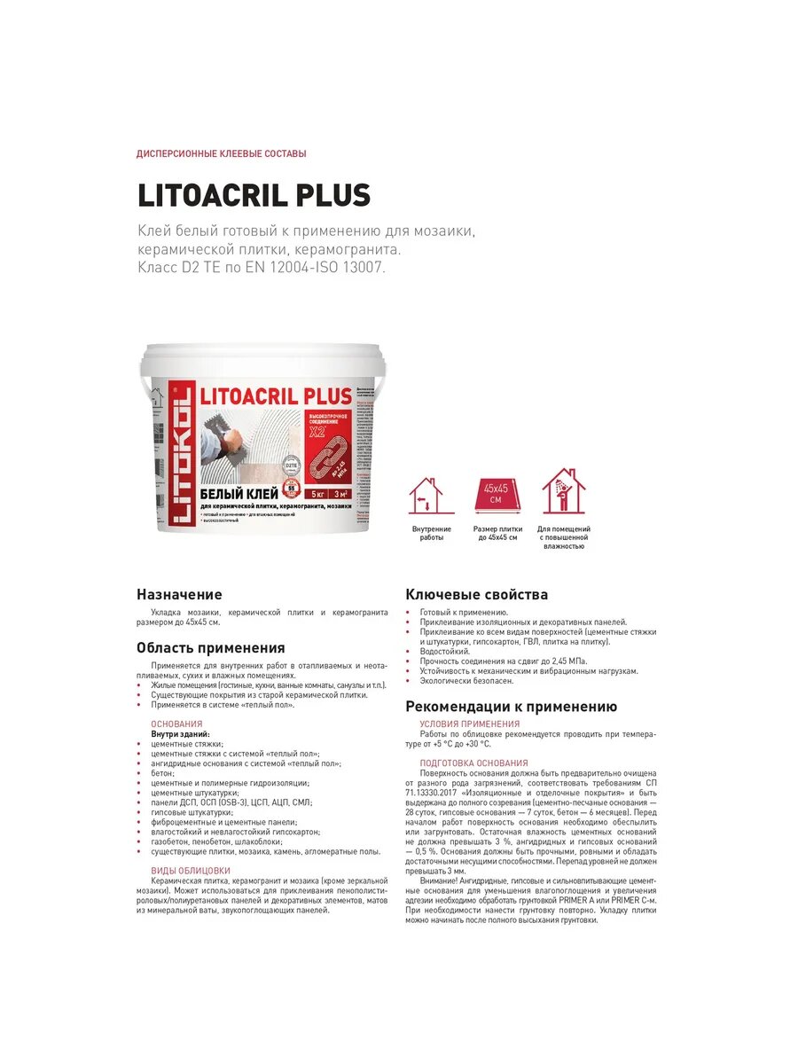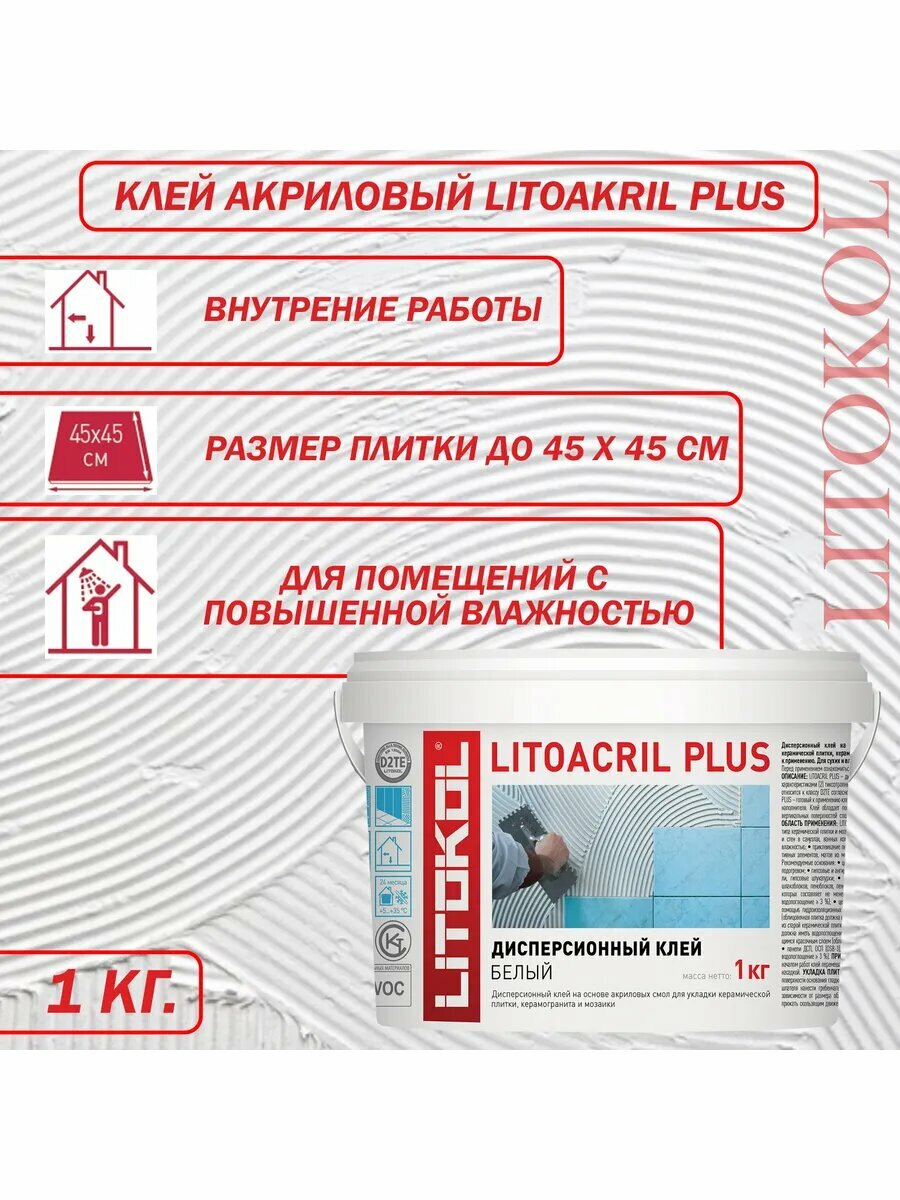 Литокол Литоакрил Плюс клей для плитки готовый (1кг) / LITOKOL Litoacril Plus дисперсионный клей для плитки, керамогранита и мозаики белый (1кг)
