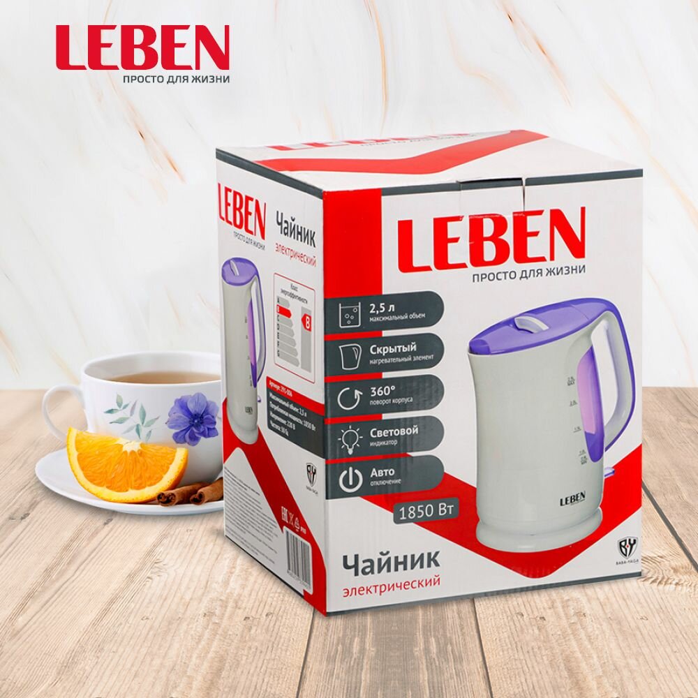 Купить Чайник электрический LEBEN 2,5 л, 1850 Вт, скрытый нагревательный элемент, пластик