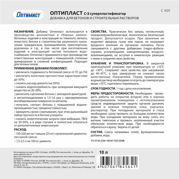 Пластификатор Оптимист Оптипласт С 409, 10 л, Россия интересное:
