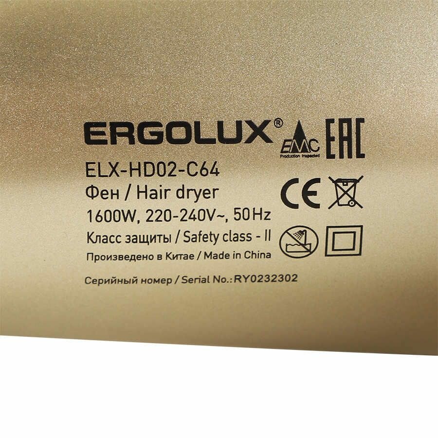 черный/золото (фен со складной ручкой, 1600Вт, 220-240В), ERGOLUX ELX-HD02-C64 (1 шт.)