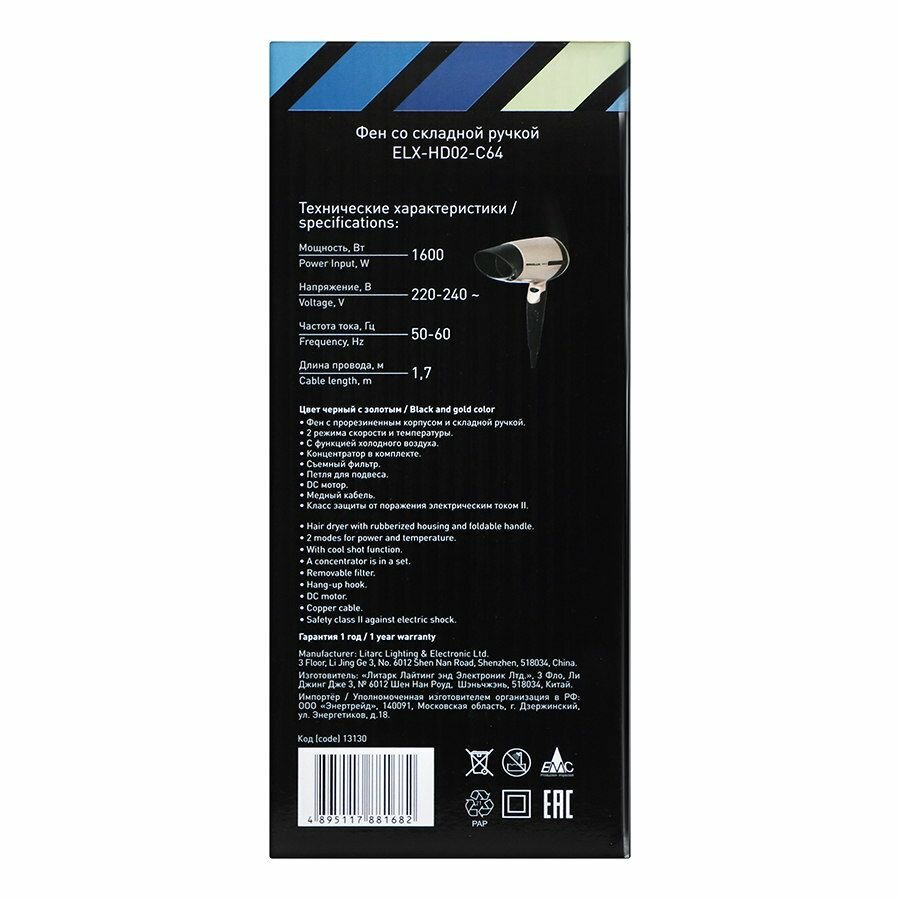 Фен со складной ручкой ELX-HD02-C64 черный/золото (1600Вт, 220-240В) ERGOLUX