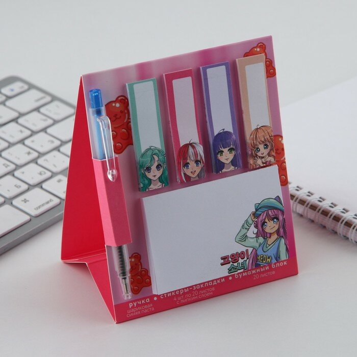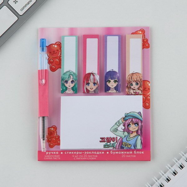 Купить Набор стикера-закладки и ручка "Аниме", 20 л в блоке