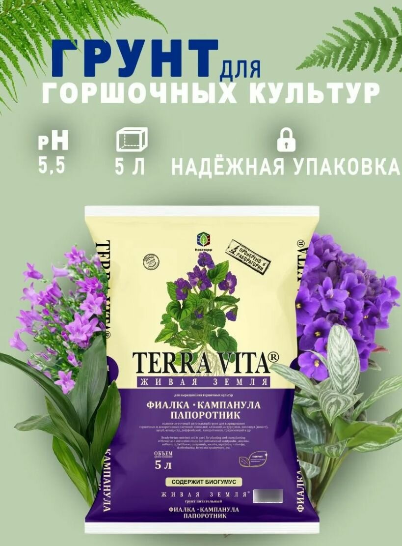 Грунт Живая земля Terra vita Фиалка-Кампанула-Папоротник 5л