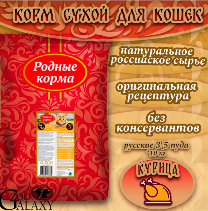 Родные корма 26/12 3/5 пуда 10 кг сухой корм для взрослых кошек с курицей