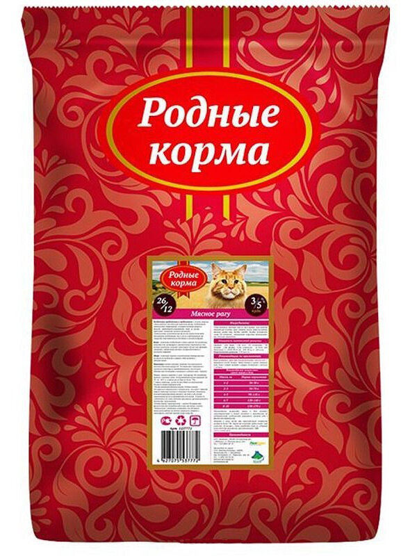 Корм сухой родные корма 26/12 5 русских фунтов для взрослых кошек, мясное рагу 2,045 кг