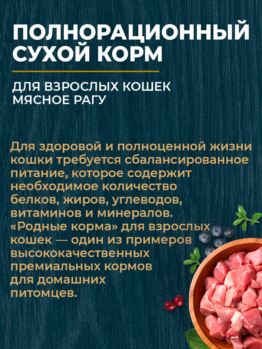 СохранитьРодные корма 10 кг полнорационный сухой корм для взрослых кошек мясное рагу интересное: