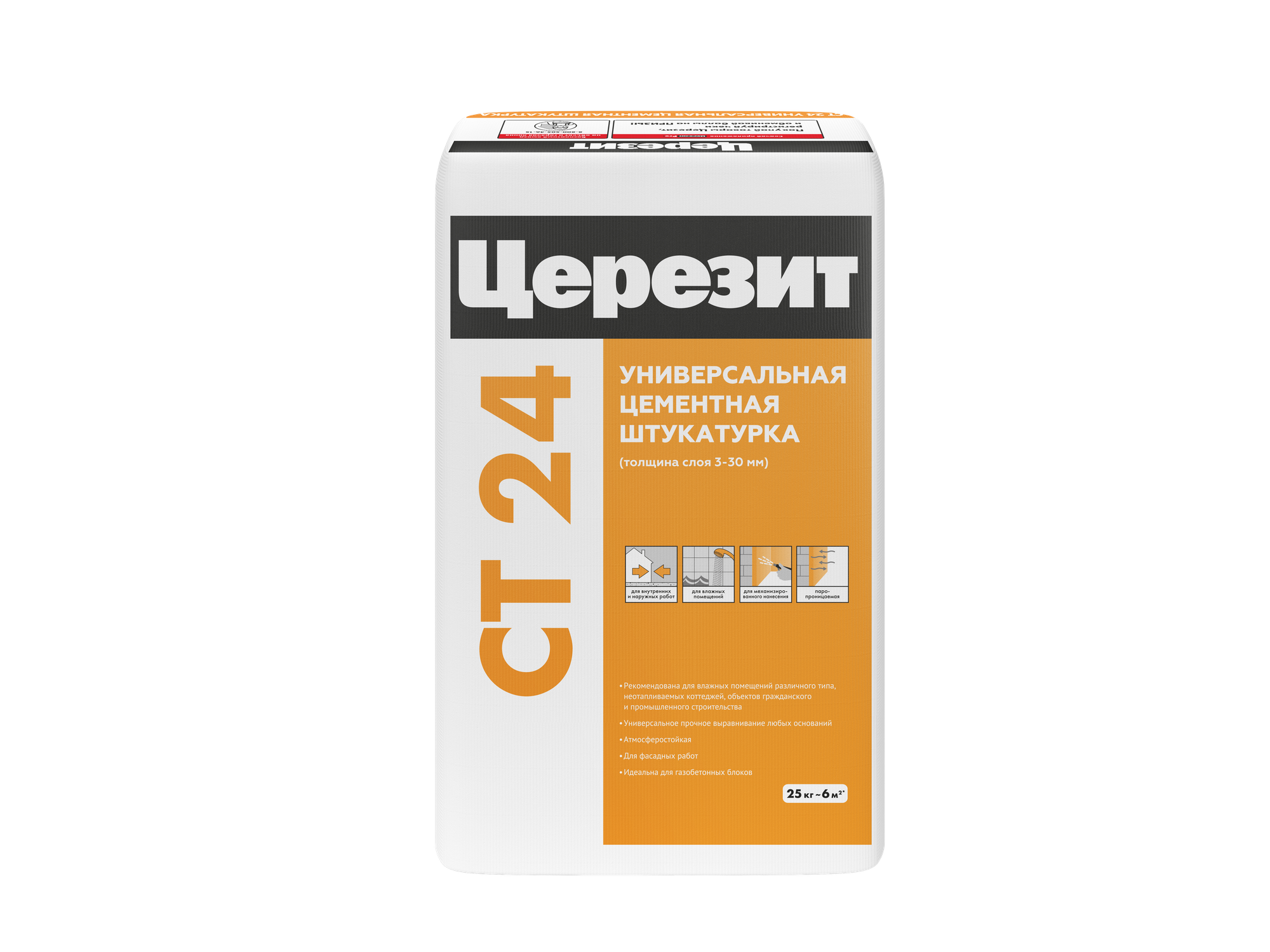 Штукатурка для Ячеистого Бетона Ceresit CT 24 25кг Универсальная, Цементная, Толщина Слоя 3-30 мм / Церезит СТ 24. интересное: