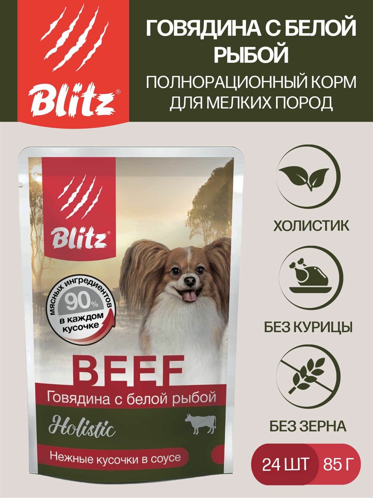 Влажный корм(паучи) для взрослых собак мелких пород Blitz Holistic "Говядина /Белая рыба" кусочки в соусе (85гр х 24 шт)
