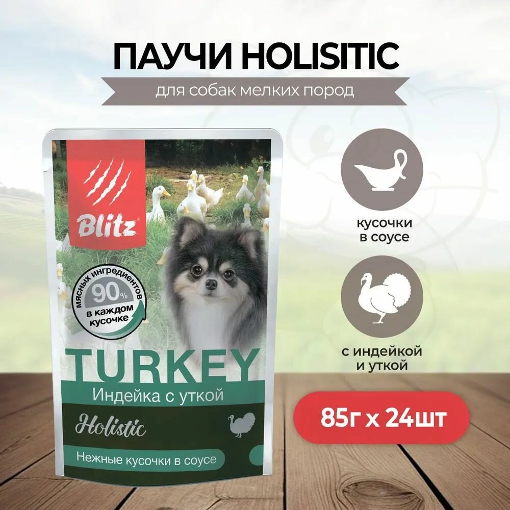 Купить BLITZ Holistic Turkey влажный корм для собак мелких пород с индейкой и уткой, кусочки в соусе (85 гр*24 шт)