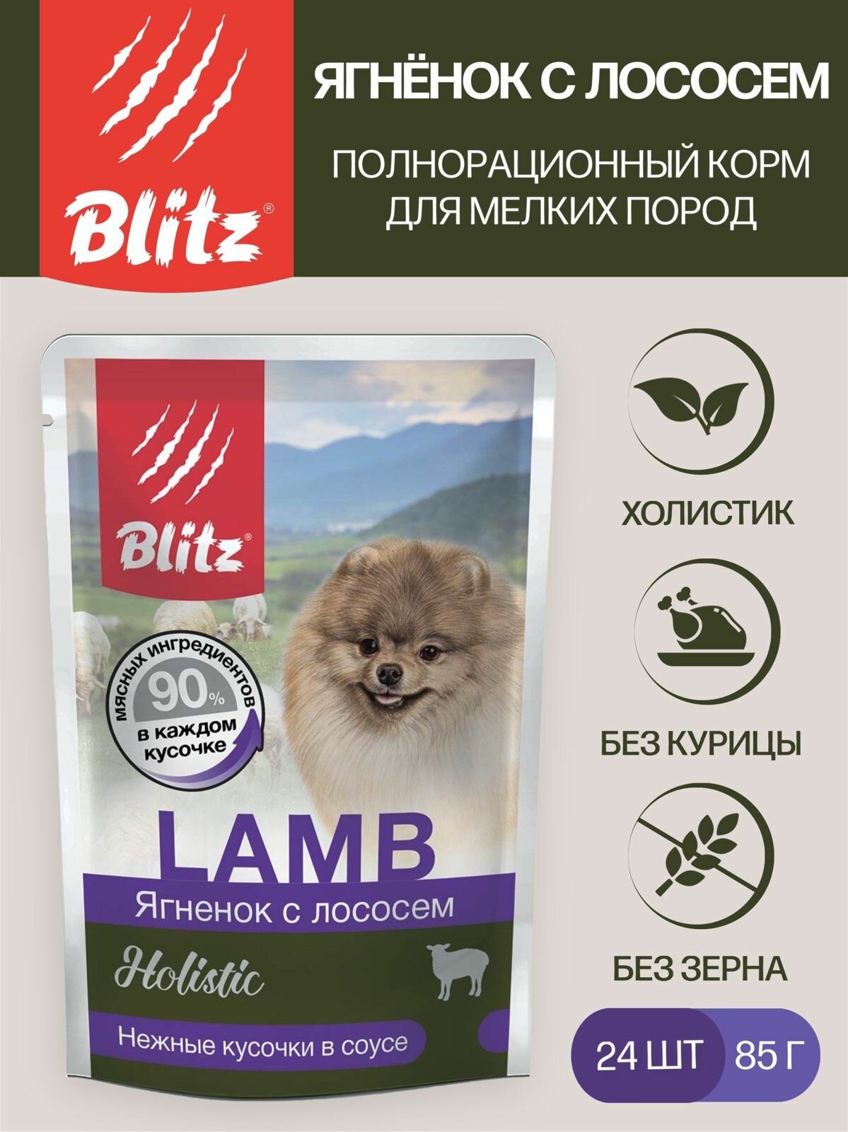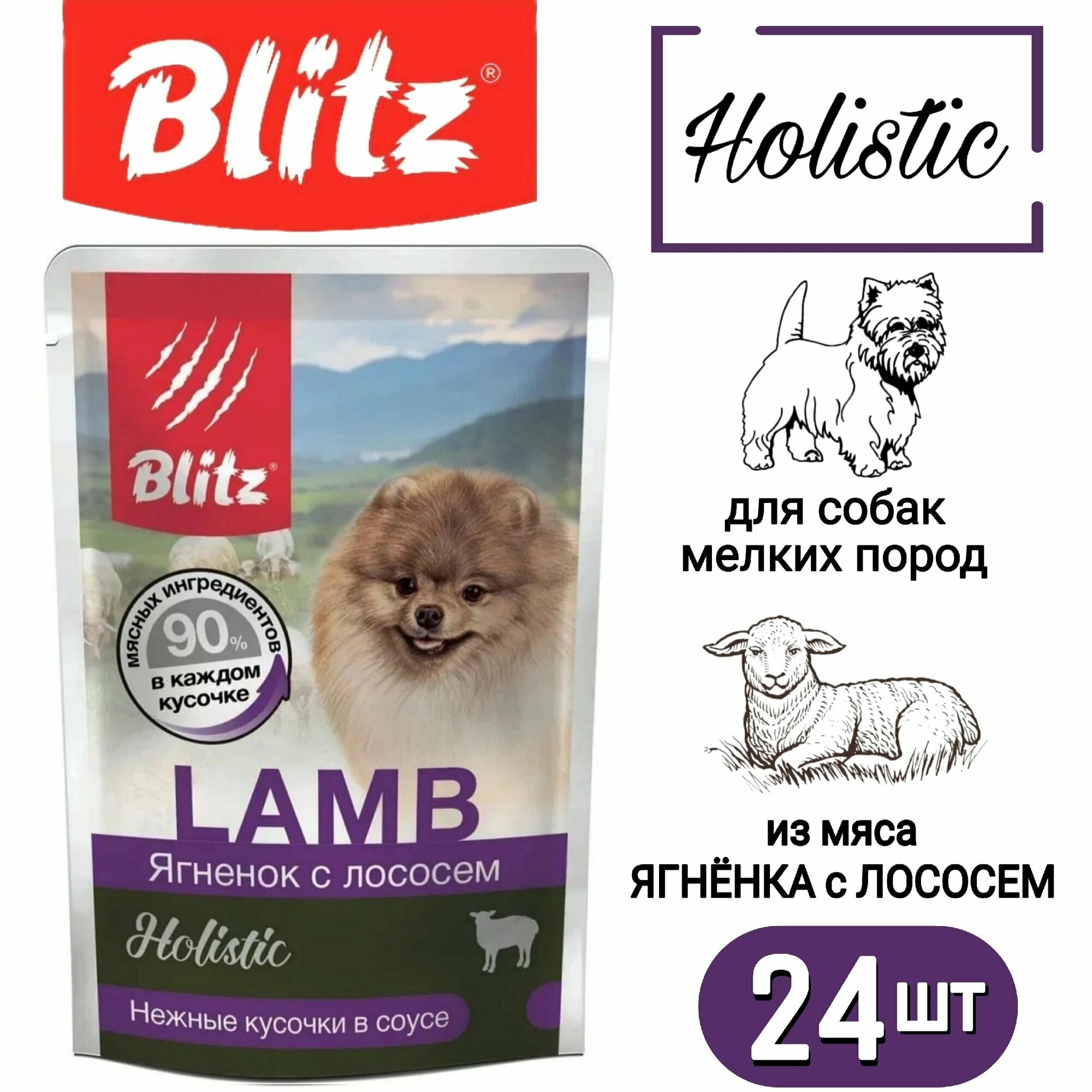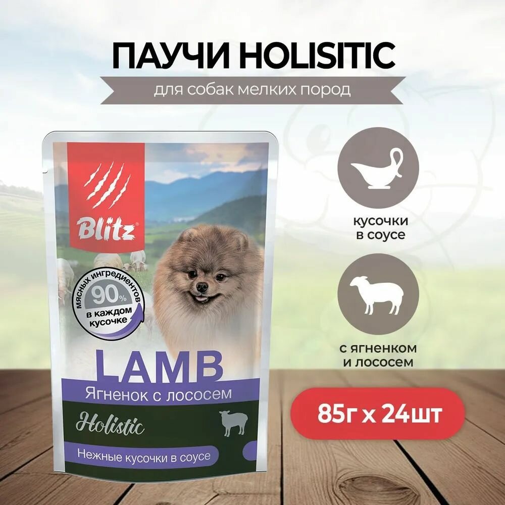 Купить Корм для собак влажный Ягнёнок с лососем, для мелких пород 85 г * 24 шт (паучи) Blitz Holistic