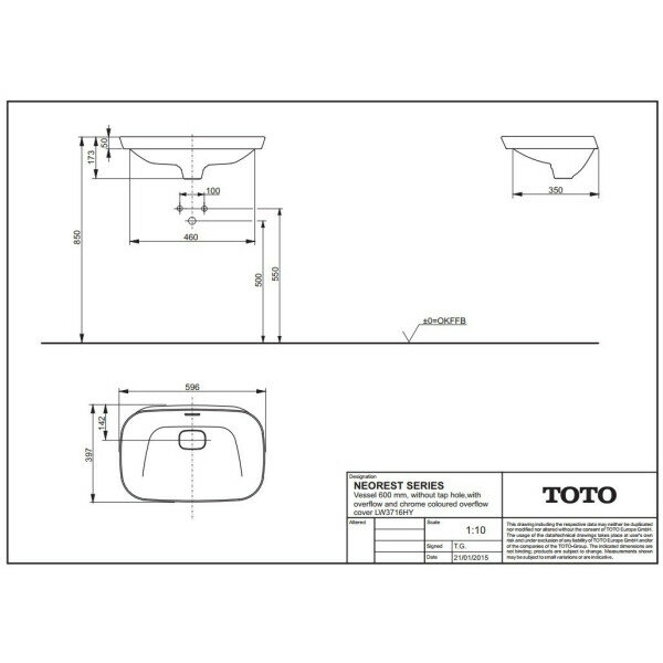 TOTO NEOREST Раковина 596x397x173(50) мм, полувстраив, без отв. под смеситель, с переливом,с декорат керамической накладкой, CeFiONtect цвет:бел