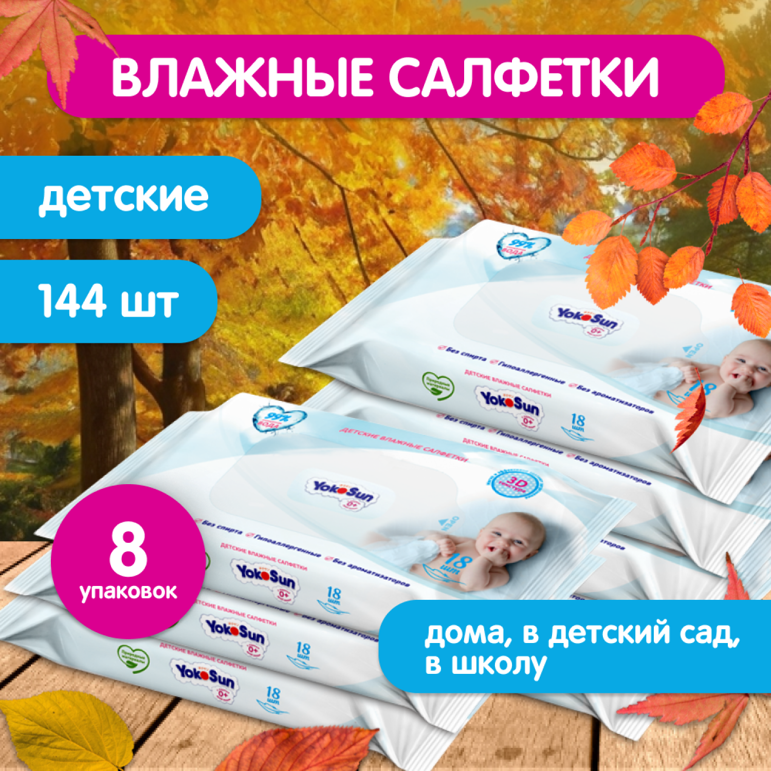 Влажные салфетки Yokosun Детские, липучка, 18 шт., 8 уп.