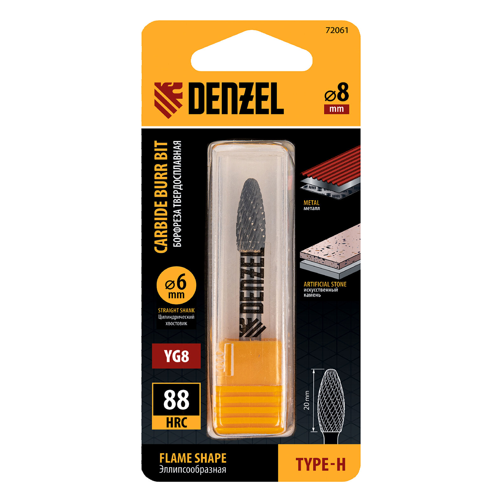 Борфреза по металлу твердосплавная, эллипсообразная, тип-H, 8 мм Denzel 72061