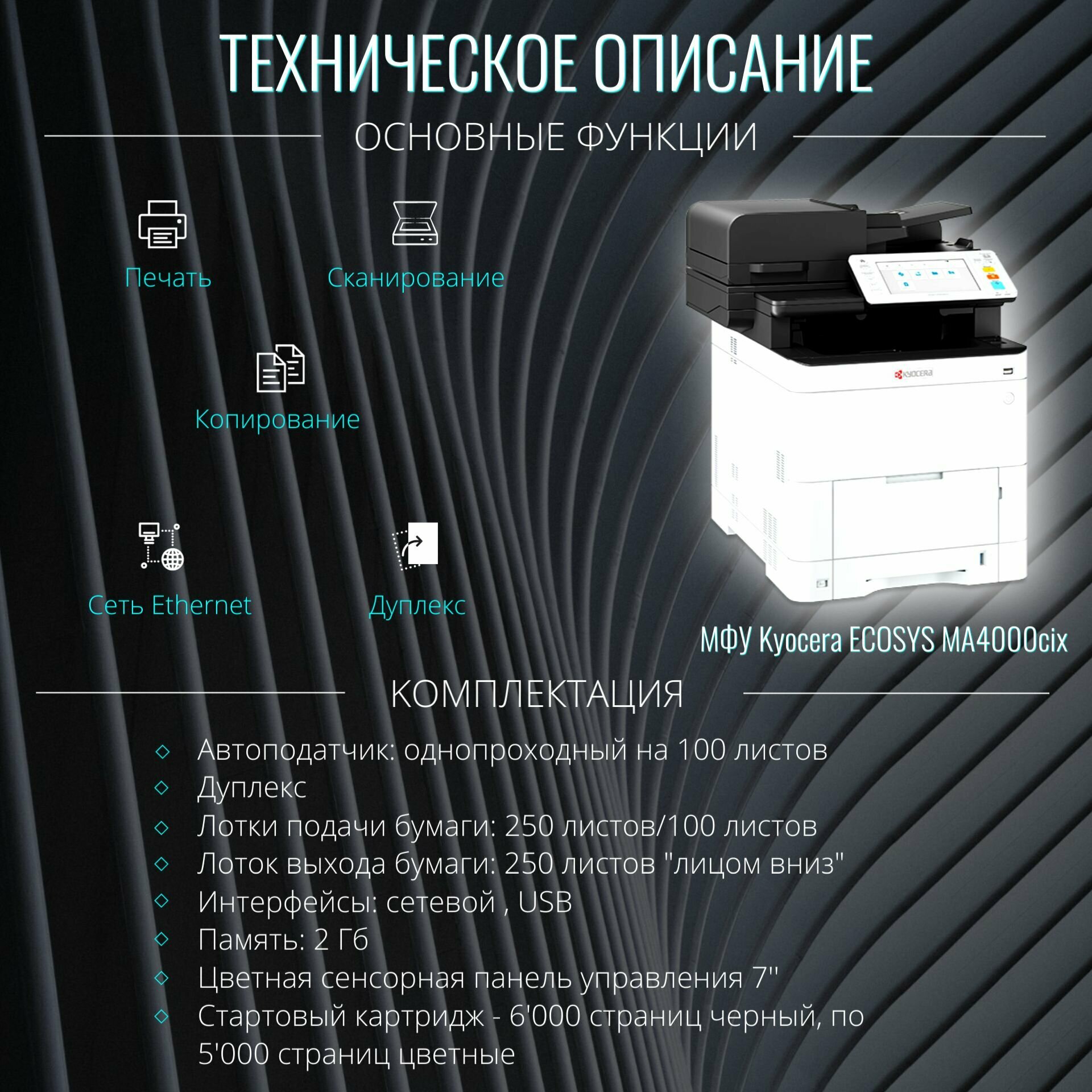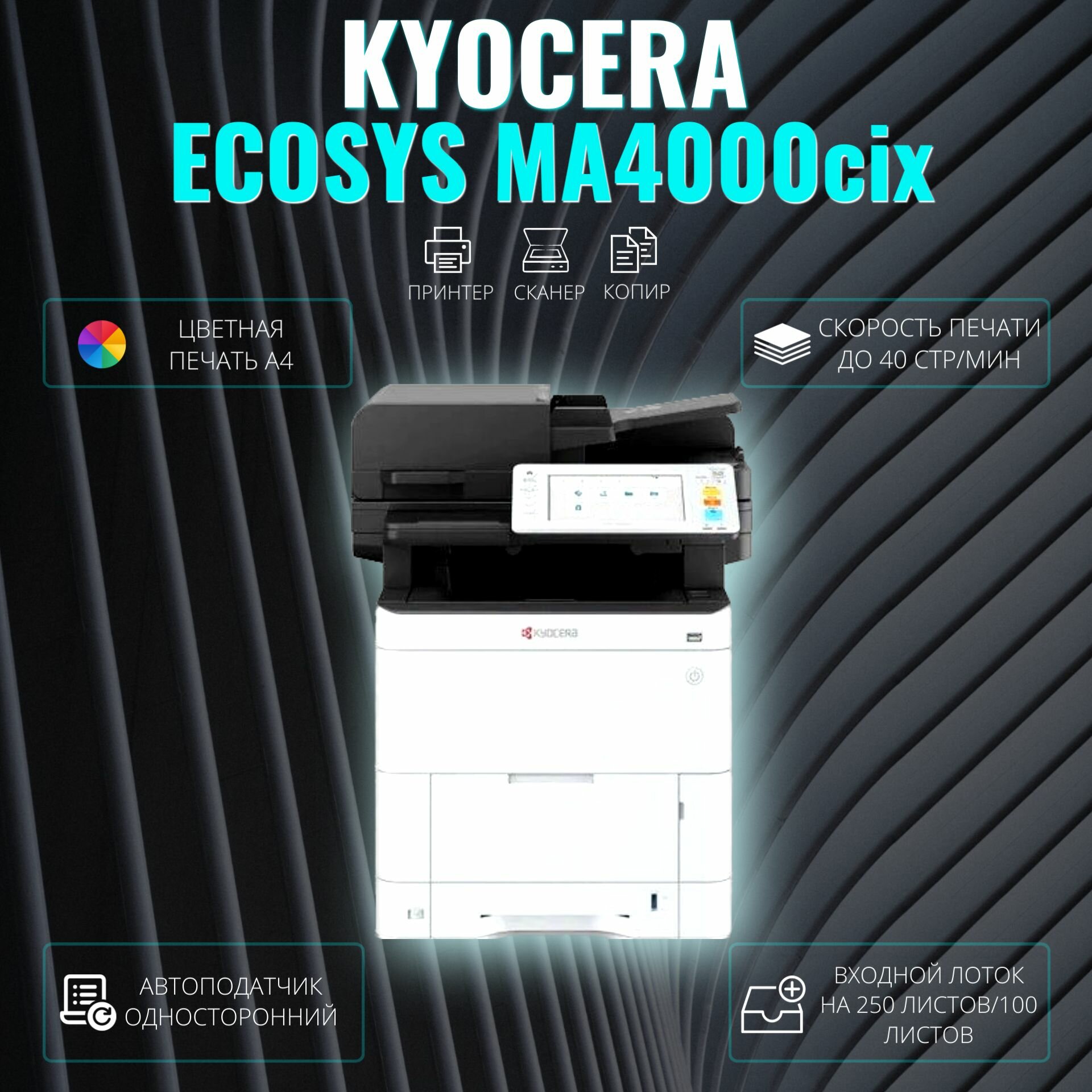 Kyocera ECOSYS MA4000cix (P/C/S, цвет. лазерный, A4, 40 стр/мин, 1200x1200 dpi, 2 Гб, USB 2.0, Network, лоток 250 л., Duplex, DADF, старт.тонер 6000/5000 стр.)