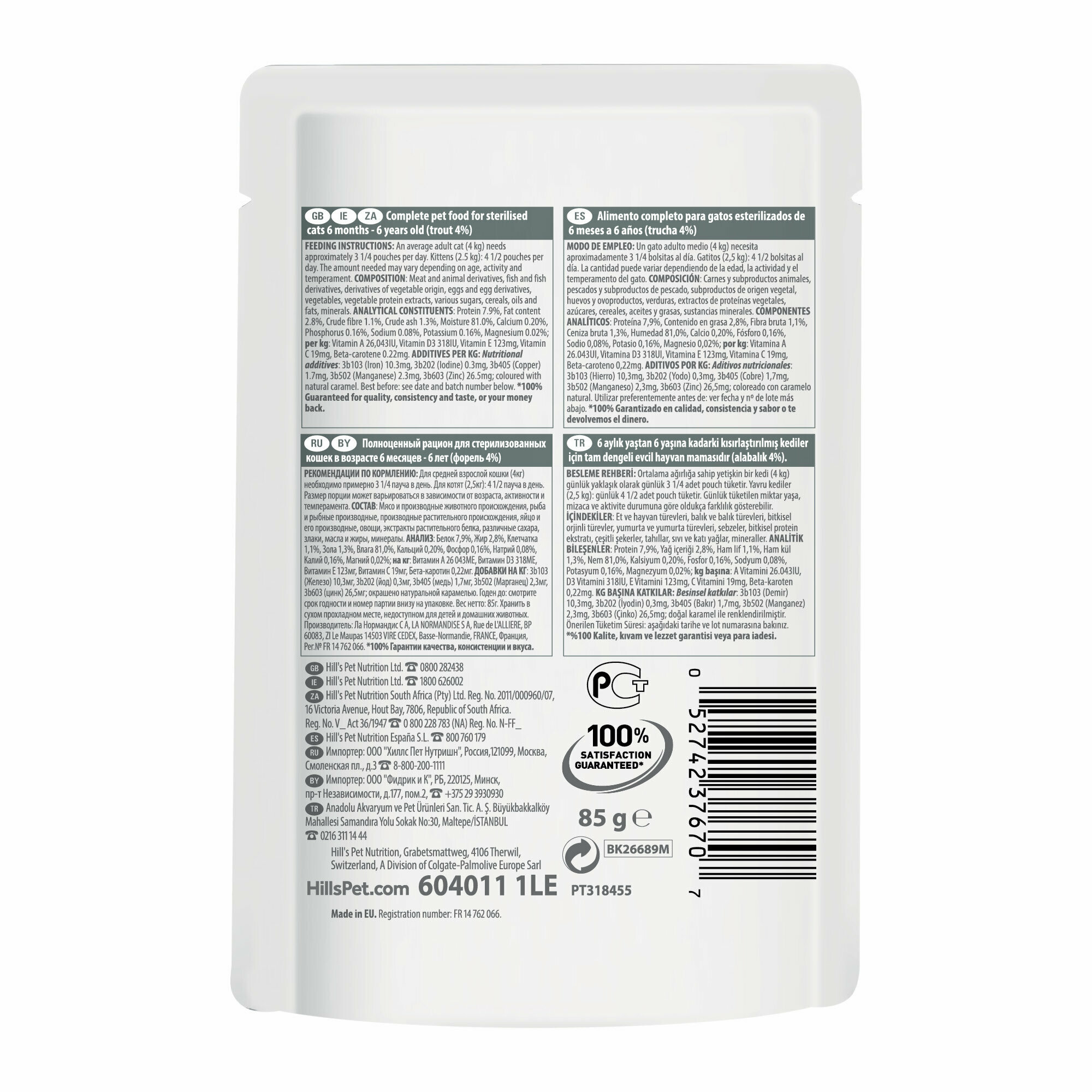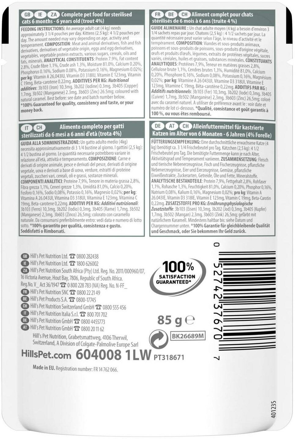 HILL`S 85гр Корм для стерилизованных кошек до 6 лет Форель (пауч)