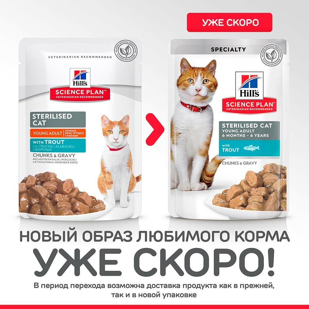 Влажный корм Hill's Science Plan для молодых стерилизованных кошек и кастрированных котов, пауч с форелью в соусе, 85 г-12 шт.