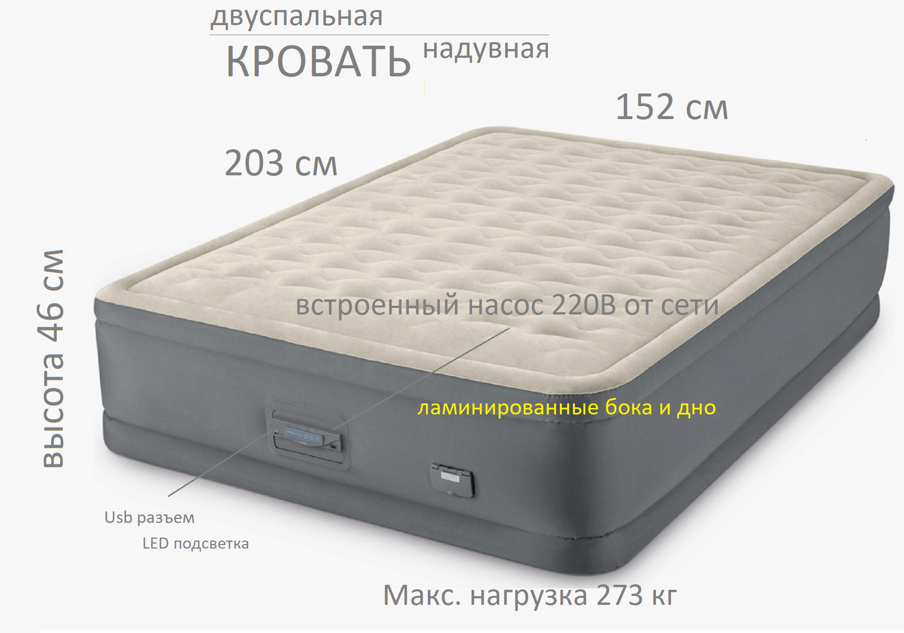 Двуспальная надувная кровать 152х203х46см "Premaire Elevated" встр.нас. 220В, до 272кг, 64926