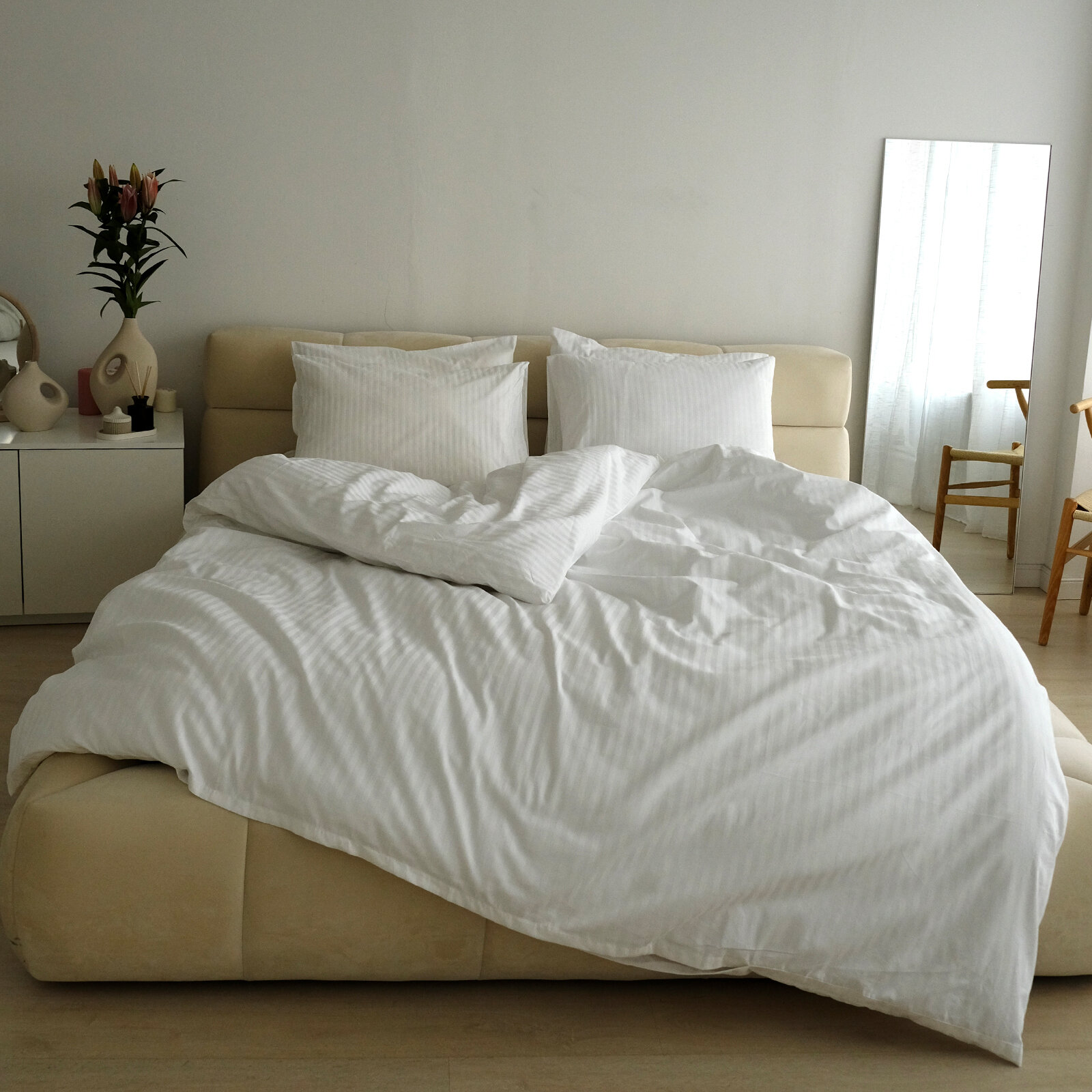 Простыня на резинке SCANDIBOO Страйп-Сатин 200х200 см белая, хлопок 100%