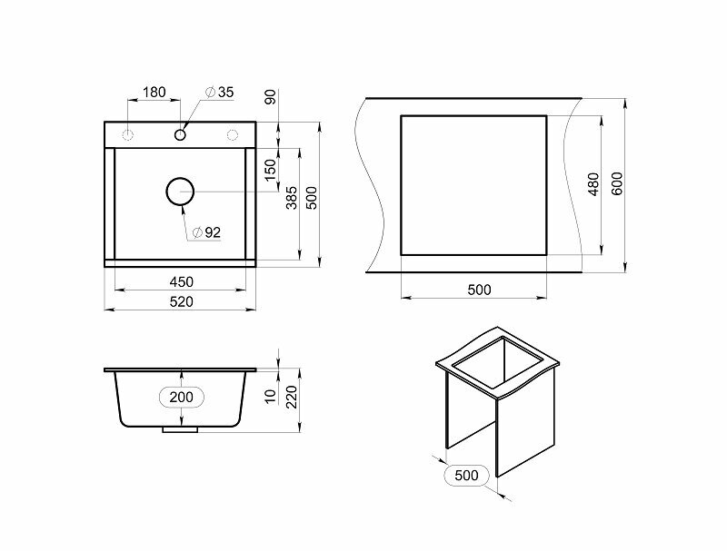 Кухонная мойка кварцевая Granula GR-5551 квадратная подстольная односекционная, подстольная, чаша 500х380, цвет черный (5551bl)
