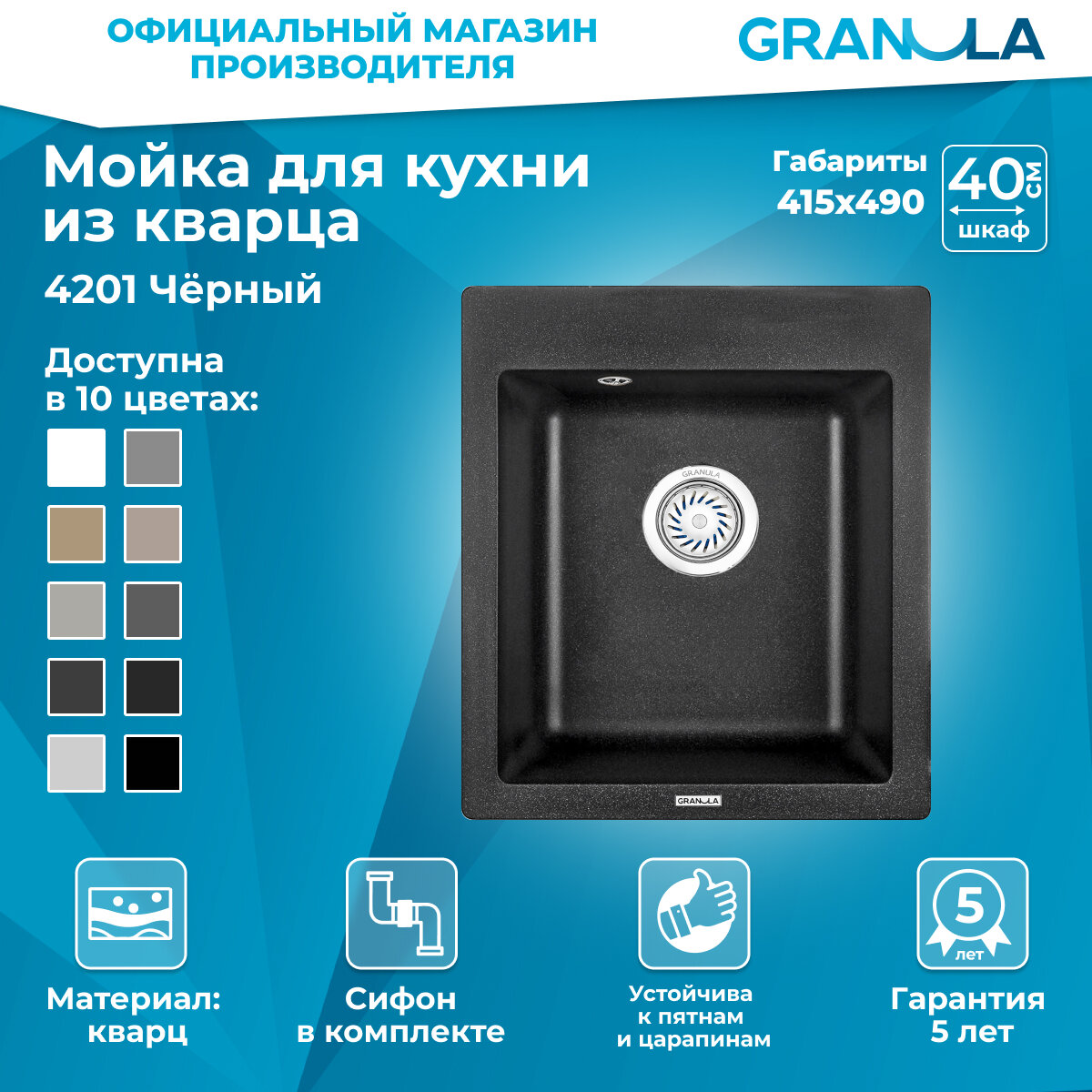 Мойка для кухни врезная кварц GRANULA 46x45x20 Кухонная раковина в комплекте с сифоном. Цвет черный