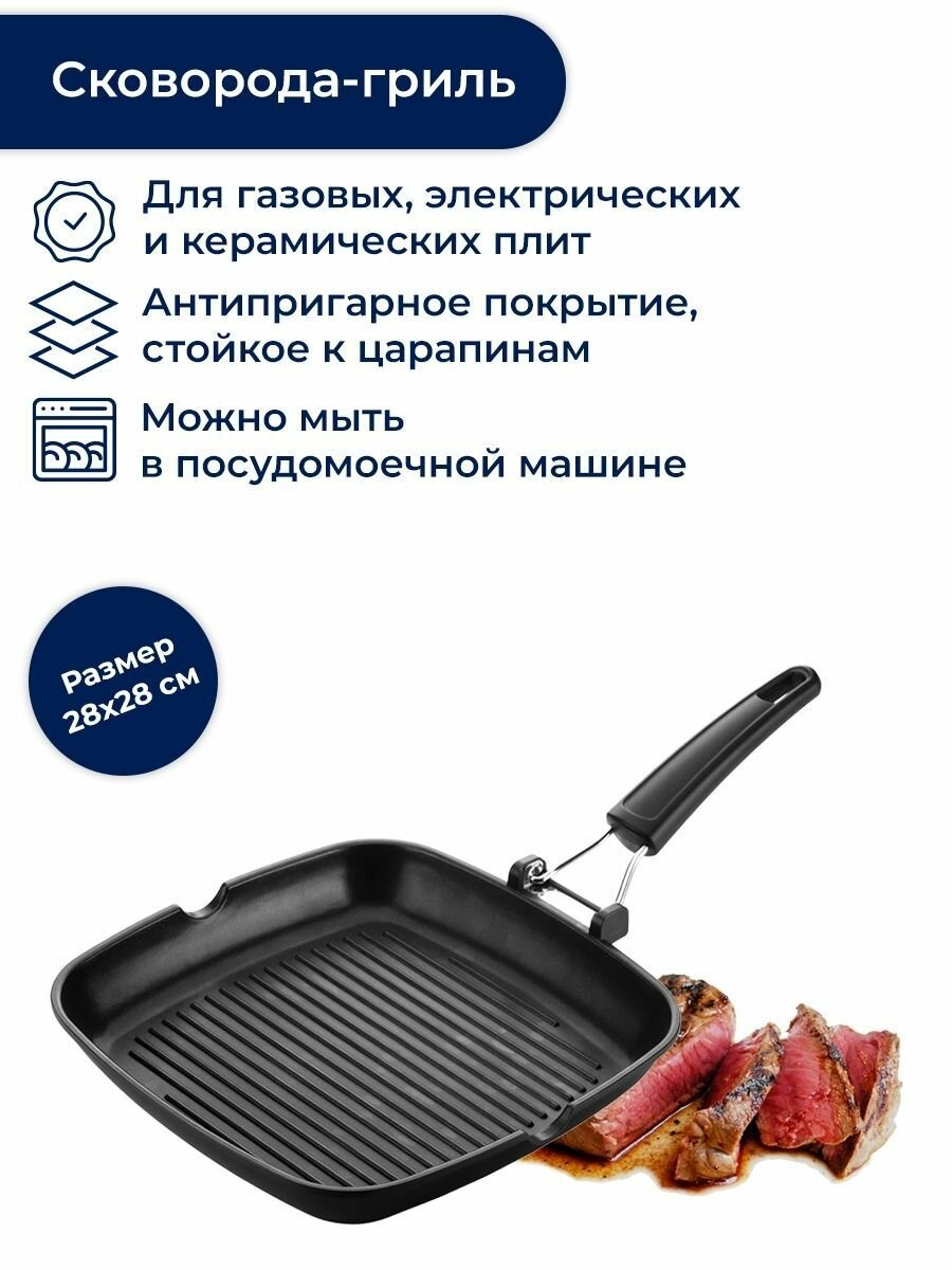 Сковорода гриль 28х28 см со складной ручкой, с антипригарным покрытием, Tescoma Premium 601252