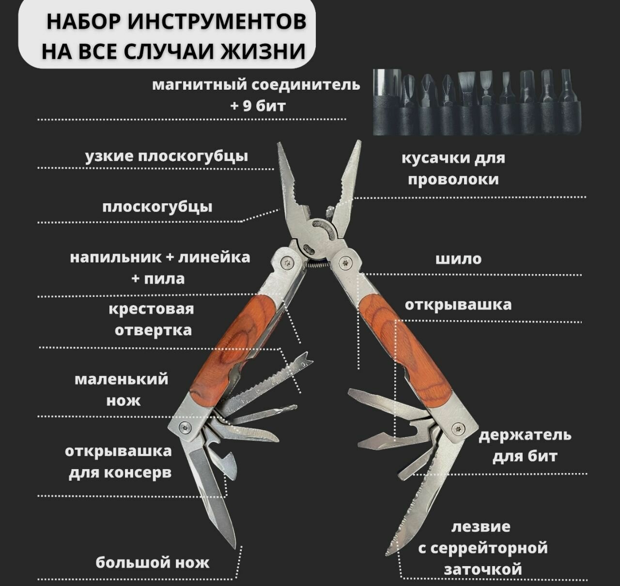 Ниже Вы можете прочитать отзывы на Мультитул походный армейский, тактический набор инструментов, нож складной туристический инструмент для рыбалки, открывашка для консервов, набор отвёрток, плоскогубцы, кусачки, ознакомится с подробными характеристиками, посмотреть интересные обзоры и фотографии на Мультитул походный армейский, тактический набор инструментов, нож складной туристический инструмент для рыбалки, открывашка для консервов, набор отвёрток, плоскогубцы, кусачки.