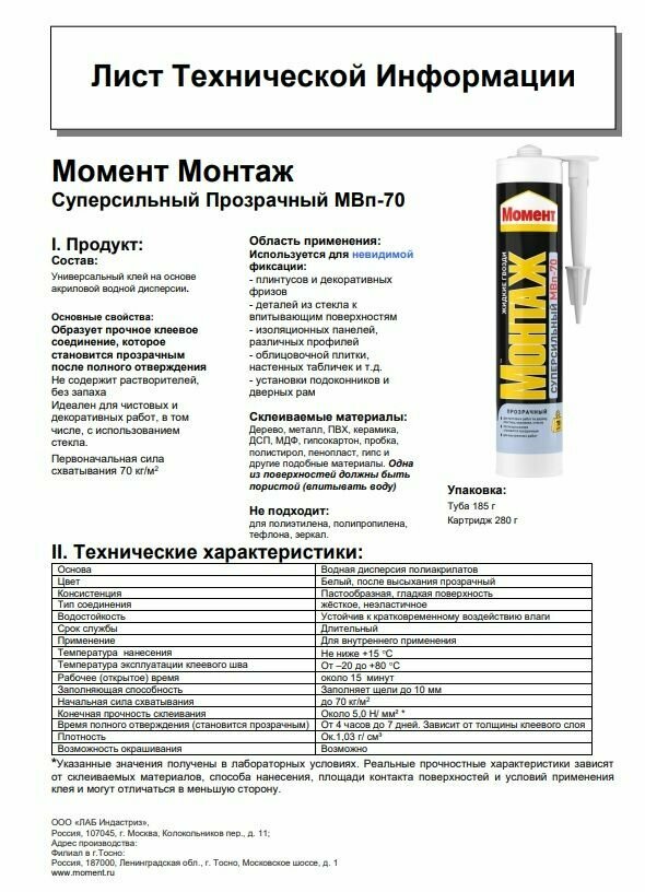 Клей Момент Монтаж Суперсильный Прозрачный МВп-70 185г (1317436), 1302575 интересное: